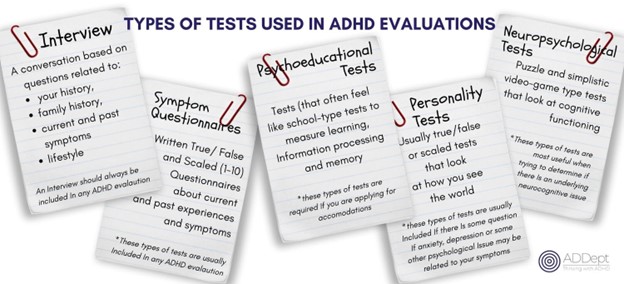 Testing for ADHD typically involves a comprehensive evaluation that includes psychological testing, behavioral assessments, and a review of the person’s medical history. The evaluation needs to be thorough to distinguish ADHD from other conditions that can have similar symptoms, such as anxiety, depression, or learning disabilities.
